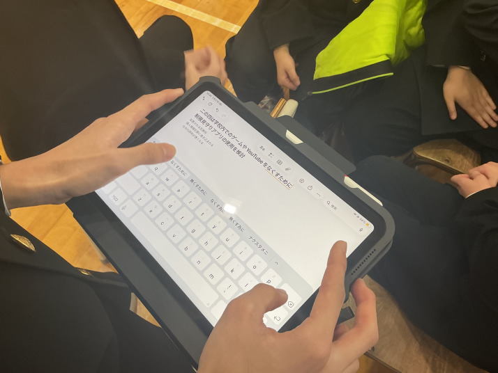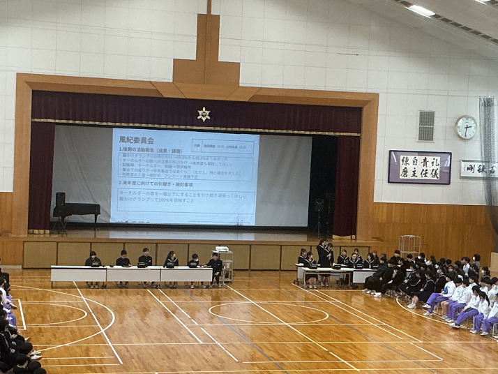 後期の生徒総会が行われました。各委員会で話合いを重ねてきたことの発表です。後半は、安全なSNSの使い方についてその場で話し合いました。個人で考えたことをクラスでまとめ、それを全校生徒に共有するという、生徒だけで進行する姿に成長を感じます。