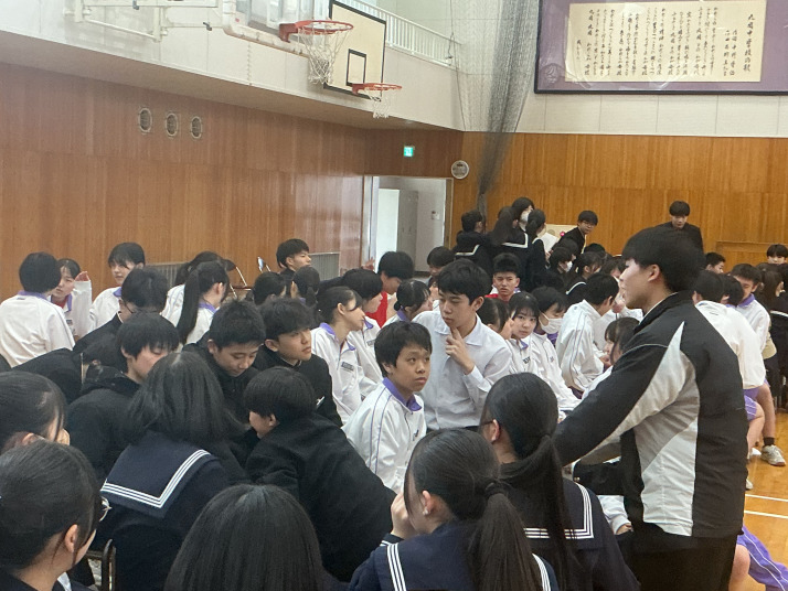 後期の生徒総会が行われました。各委員会で話合いを重ねてきたことの発表です。後半は、安全なSNSの使い方についてその場で話し合いました。個人で考えたことをクラスでまとめ、それを全校生徒に共有するという、生徒だけで進行する姿に成長を感じます。